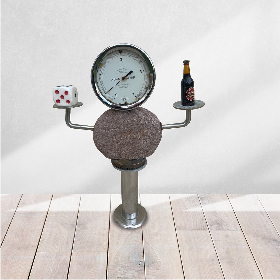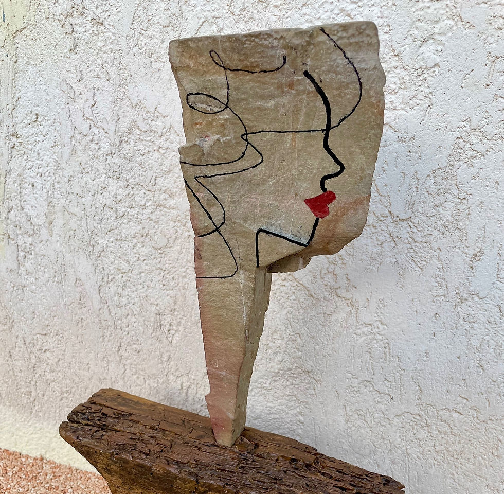 Il crée des sculptures où les pierres défient la gravité pour former des objets uniques, insolites, étonnants. Il choisit les matériaux selon l’inspiration, l’humeur du moment (galets, pierres, métal, jouets, bois ,mosaïque)